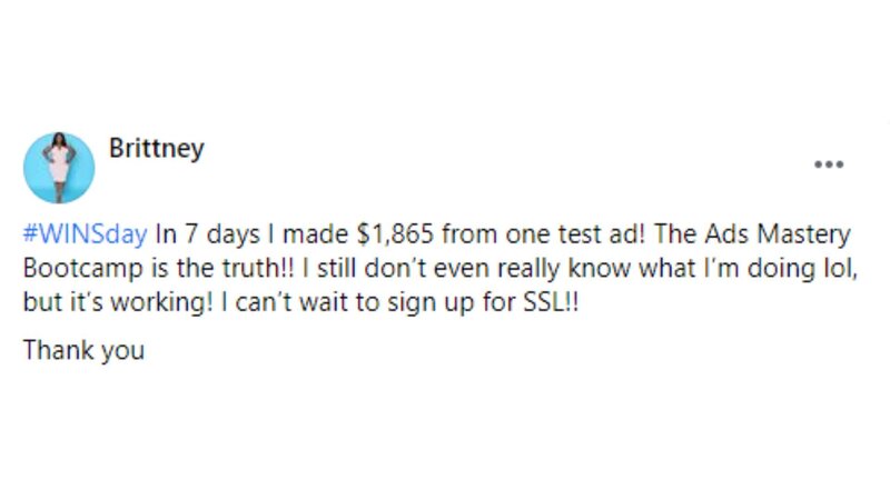 The Social Sales Lab™️ is our signature program that teaches busy business owners how to launch, scale and automate full blown, high-profit ad campaigns. This is done through a combination of our 8-step curriculum, live coaching, and a private community of like-minded entrepreneurs. We’re not just teaching you to run ads, we’re diving deep, teaching you every facet of creating and running a successful and profitable marketing system, providing you with personalized funnels and techniques, and teaching you in-depth strategies for effectively targeting your dream clients. Ultimately, you walk away from SSL with ads, strategy, knowledge and, most importantly, more time and financial freedom.